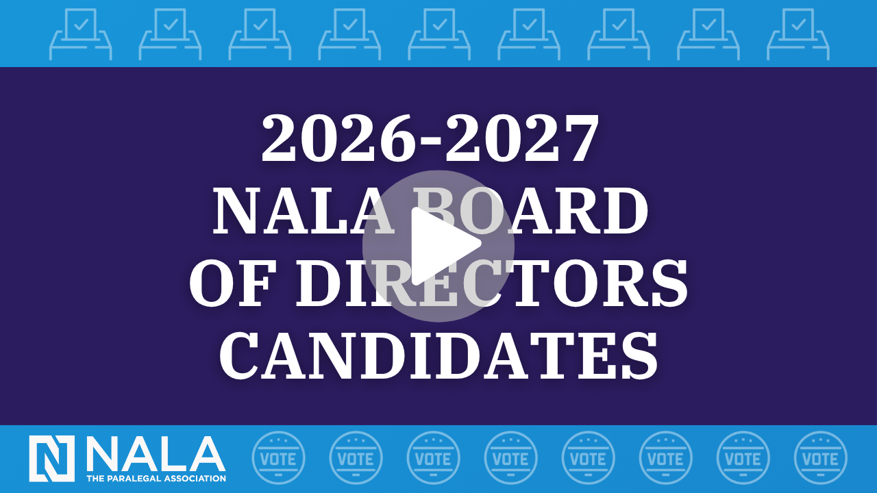 Members with an Active type membership for at least 45 days prior to the Annual Membership Meeting can vote electronically. Voting will be conducted online, allowing you to cast your vote from your office, home, or mobile device. Details and validation instructions will be sent to the primary email address in NALA’s database. If you are unable to vote during the designated voting period, you may submit a proxy form to NALA by July 7th to ensure your vote is counted. Voting will be open from June 11 through July 9, 2026. Election results will be announced during the Annual Membership Meeting at the NALA Conference on July 16, 2026.