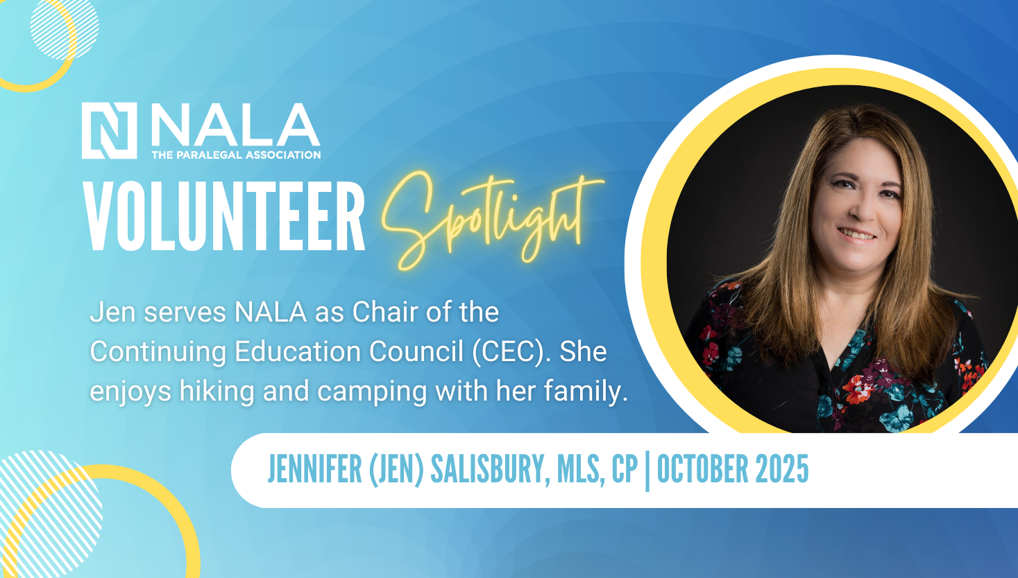 Jennifer (Jen) Salisbury, MLS, CP, is the Chair of NALA’s Continuing Education Council (CEC). She is using her leadership skills and deep-rooted passion for education to help shape the legal […]