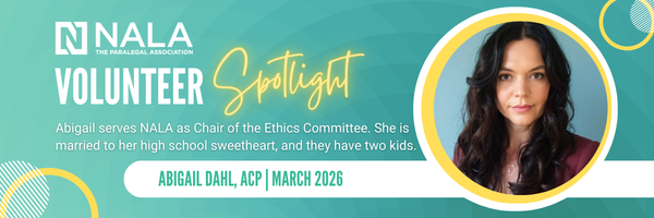 Abigail chose to volunteer with NALA because she believes in “strengthening the professional standards and long-term credibility of the paralegal field.” As her career progressed into higher-level business and legal roles, she saw firsthand how “high expectations of performance, strong ethical frameworks, and a culture of continuous development” are essential to successful organizations.