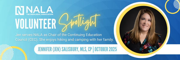 Jen has been a NALA member for over a decade, since 2013. She loves the educational offerings and getting to know paralegals from across the country. She has found the networking extremely beneficial. When she was working in a law office, she was able to reach out to paralegals outside of Nevada for advice and insights. She encourages other NALA members to get involved and give back.